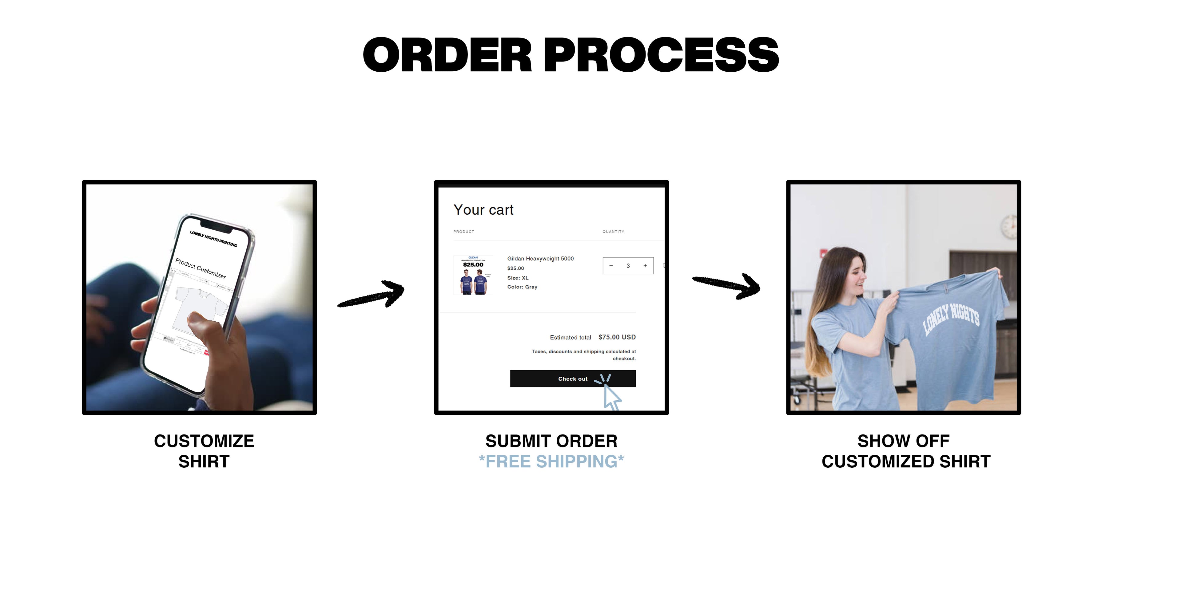 Upload. Print. Ship. Upload your design (PNG preferred) We review, print, and press your shirt Your order ships free to your door no minimums